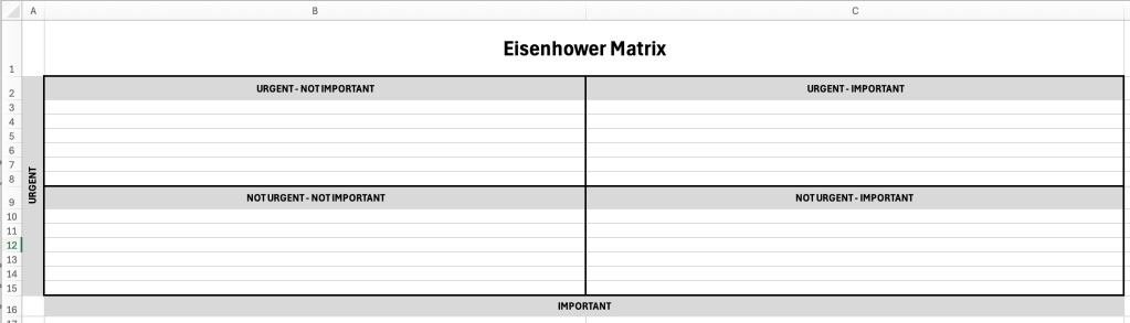 An Eisenhower Matrix as a Spreadsheet. If you are a spreadsheet person, build yourself something that looks similar to the one below. It will help you visualize your decisions and tasks, and you can cut and paste items as their priorities change. Create an area on your spreadsheet to save the progress you have made. Add a date to show when it was completed.